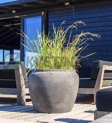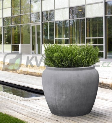 Venkovní květináč Alegria Water Jar Round Grey kulatého tvaru s rozměry 50 x 41 cm má šedou matnou barvu a je odolný UV záření. Ručně vyrobený z kompozitního materiálu a cementu, který odolává mrazům a povětrnostním podmínkám.