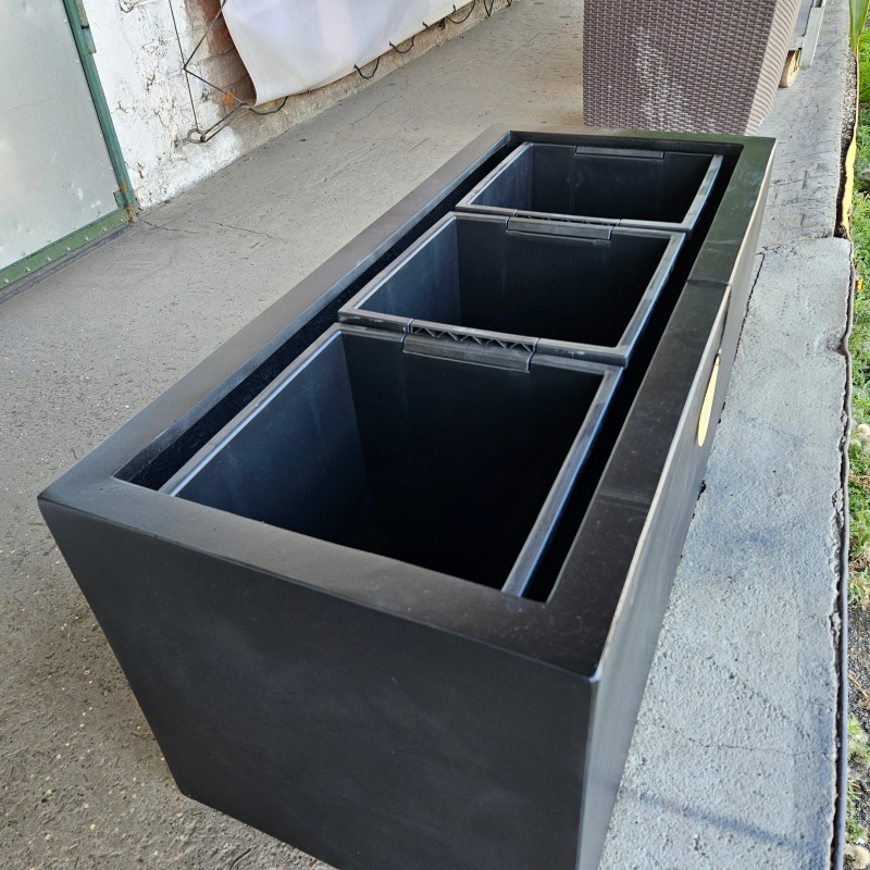 Truhlík Alfa s rozměry 100 x 50 x 50 cm má černou matnou barvu a je vyrobený ze syntetického vlákna a drceného kamene. U tohoto materiálu oceníte velmi dobrou odolnost vůči oděru a slunečním paprskům.