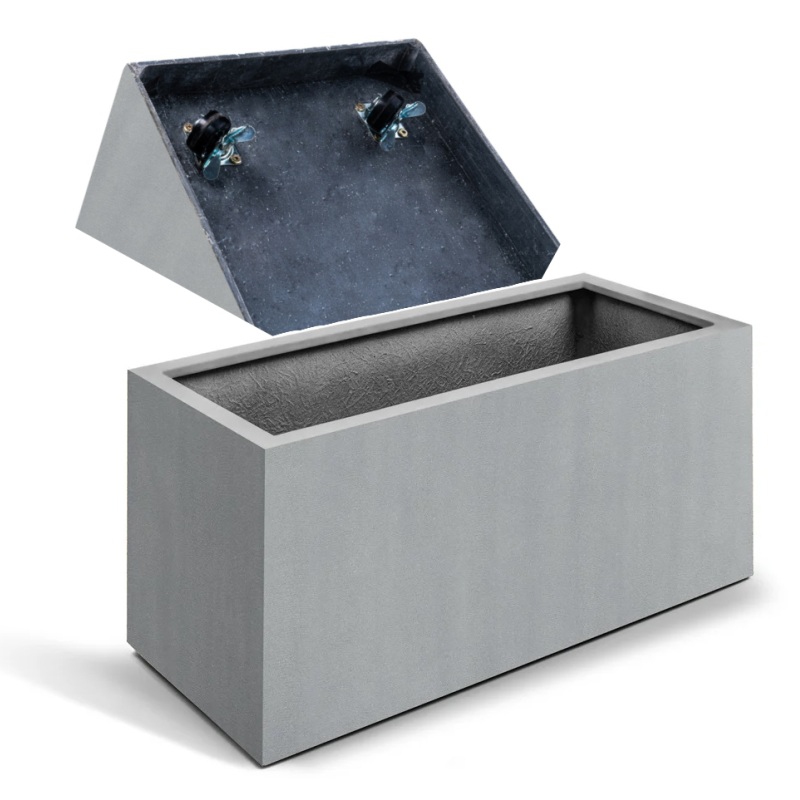 Truhlík Alfa s rozměry 90 x 40 x 40 cm má černou matnou barvu a je vyrobený ze syntetického vlákna a drceného kamene. U tohoto materiálu oceníte velmi dobrou odolnost vůči oděru a slunečním paprskům.