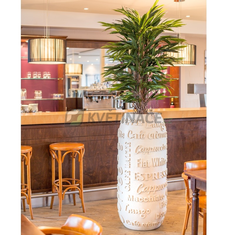 Luxusní květináč Café vysokého kulatého tvaru s rozměry 40 x 90 cm má matnou pískovcovou barvu a je vyrobený z kompozitního materiálu. Květináč je díky dekorů vhodný do restaurace či kavárny. Je odolný UV záření, materiál je mrazuvzdorný a vhodný do exteriéru i interiéru. Pro osazení živou rostlinou je nutné zakoupit vodotěsnou gumovou vložku do květináčů. Doporučujeme zakoupit vodoznak pro přehled o stavu hladiny vody v květináč.