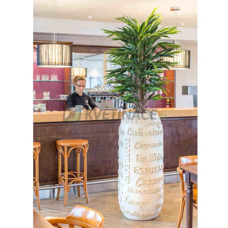 Luxusní květináč Café vysokého kulatého tvaru s rozměry 53 x 120 cm má matnou pískovcovou barvu a je vyrobený z kompozitního materiálu. Květináč je díky dekorů vhodný do restaurace či kavárny. Je odolný UV záření, materiál je mrazuvzdorný a vhodný do exteriéru i interiéru. Pro osazení živou rostlinou je nutné zakoupit vodotěsnou gumovou vložku do květináčů. Doporučujeme zakoupit vodoznak pro přehled o stavu hladiny vody v květináč.
