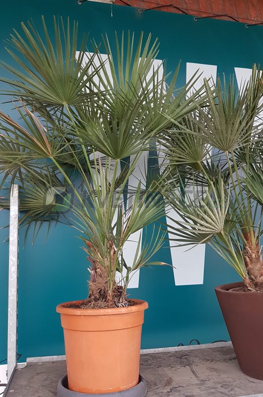 Venkovní palma Chamaerops Humilis s průměrem květináče 24cm a výškou 110cm včetně balu. Vhodná do mrazů okolo -10C.