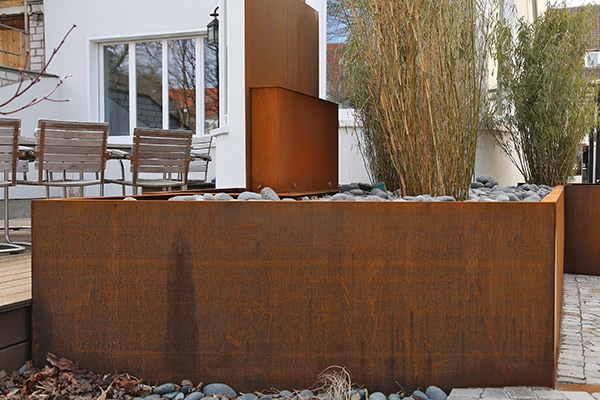 Truhlík Cortensteel Trend Topper s šířkou 80 cm, hloubkou 40 cm a výškou 60 cm je vyrobený z oceli s vysokým obsahem mědi, chromu a niklu. Tato ocel má speciální vlastnost, že na povrchu vytváří vrstvu rezavé barvy, která zabraňuje další korozi.