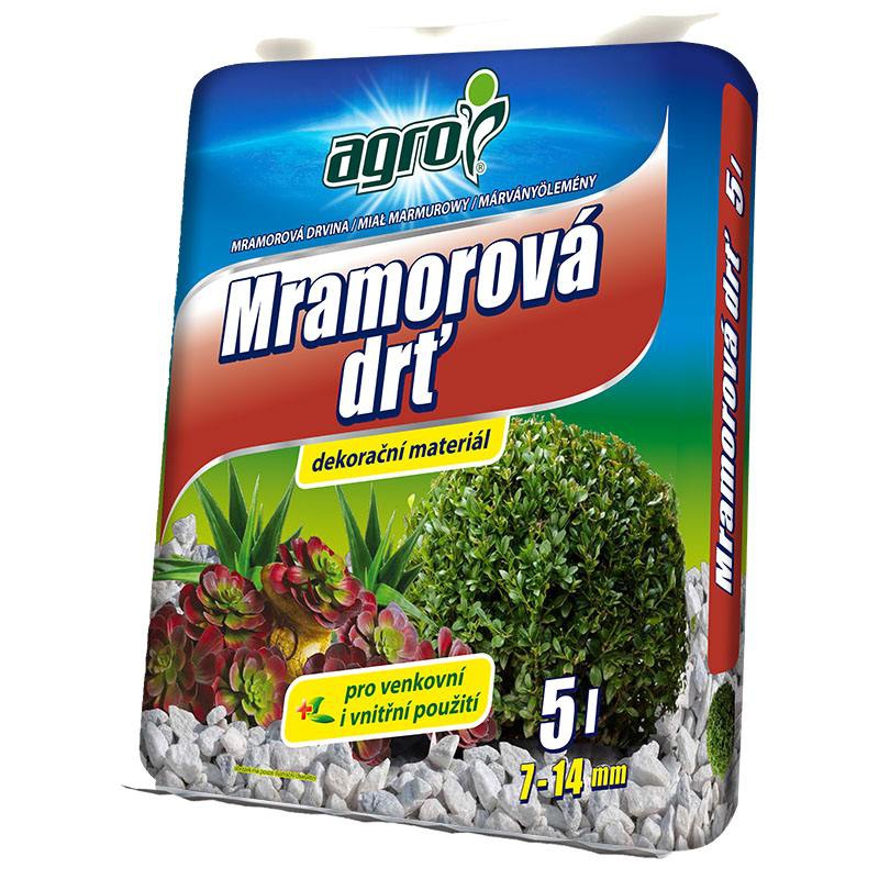 AGRO Mramorová drť slouží především pro pro dekorační účely v interiérech i exteriérech. Lze ji s výhodou použít na úpravu cest, chodníků i pietních míst či k vymezení ploch v okrasné zahradě. Slouží výborně jako dekorace do terasových nádob a květináčů.