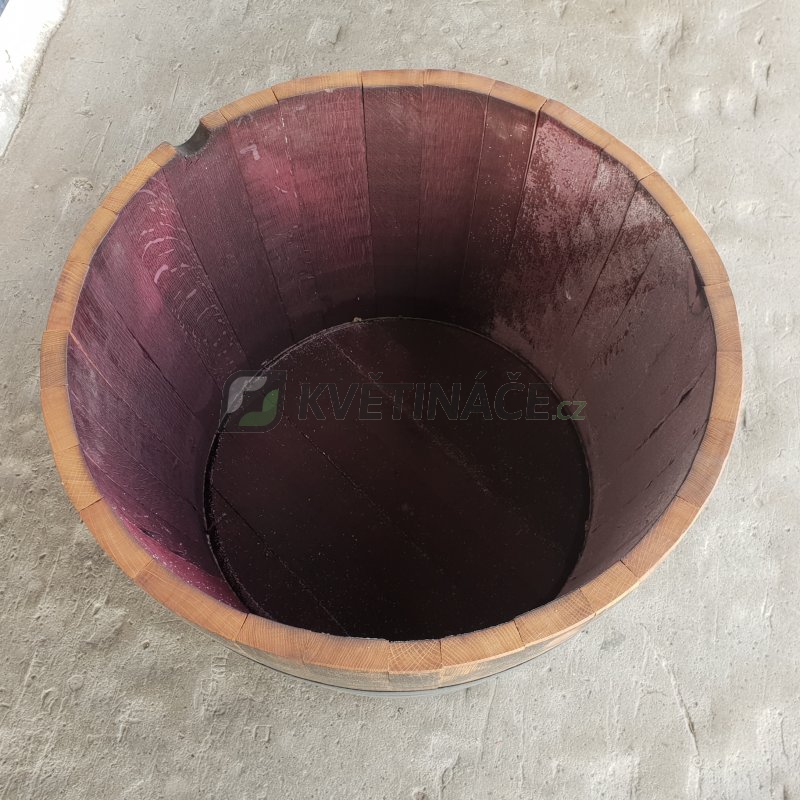 Barikovaná natřená nádrž na vodu z dubového dřeva s přibližnými rozměry 70x95 cm o objemu 230 litrů je vyrobený z použitého sudu na víno. Tím je dosažena zajímavá originální patina květináče. Součástí nádrže je horní odjímatelné víko.
