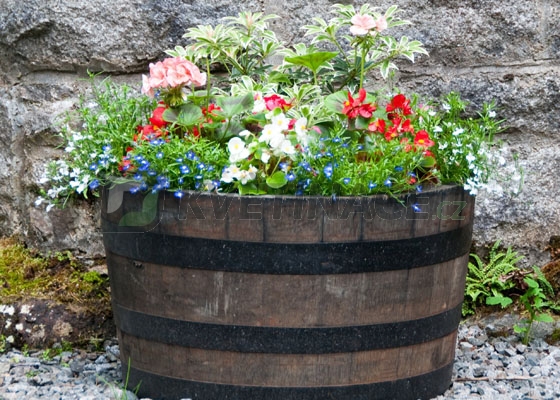 Natřený barikovaný sudový květináč z dubového dřeva s přibližnými rozměry 70x48 cm o objemu 110 litrů je vyrobený z použitého sudu na víno. Tím je dosažena zajímavá originální patina květináče. Vnější povrch je ošetřen speciálním olejem a obruče natřeny barvou. Vhodné na chalupy, roubenky a zahrady.