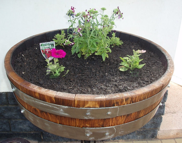 Natřený barikovaný sudový květináč z dubového dřeva s přibližnými rozměry 70x48 cm o objemu 110 litrů je vyrobený z použitého sudu na víno. Tím je dosažena zajímavá originální patina květináče. Vnější povrch je ošetřen speciálním olejem a obruče natřeny barvou. Vhodné na chalupy, roubenky a zahrady.