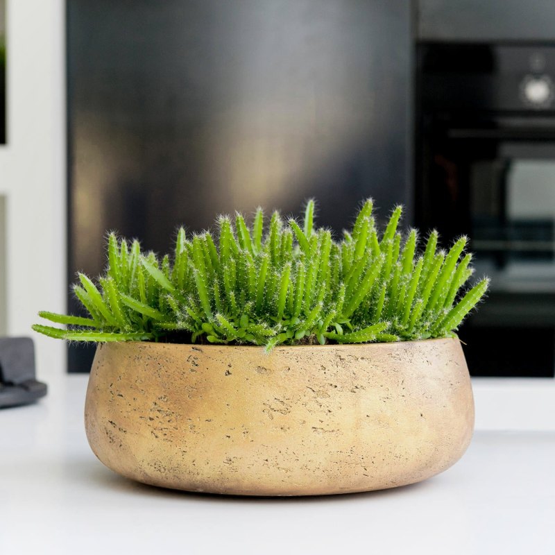 Bonsai mísa Eco-line Gold s rozměry 39x15 cm má zlatou matnou barvu. Je odolná UV záření. Ručně vyrobená z kompozitního materiálu a cementu, který odolává mrazům a povětrnostním podmínkám. Při použití v interiéru je nutné zakoupit fólii do květináčů, do které se zasadí rostlina. Fólie zaručí 100% nepropustnost vody - vhodné jen v interiéru. Při použití v exteriéru doporučujeme vyvrtat dno pro odtok vody.