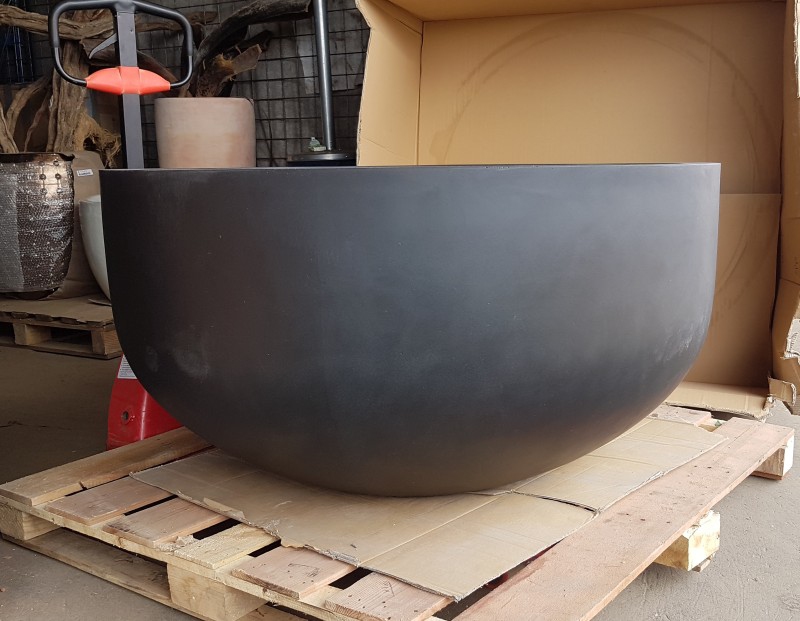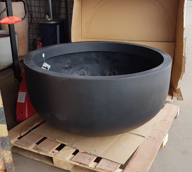 Venkovní květináč Fiberstone City black ve tvaru mísy s průměrem 110 cm a výškou 60 cm má matnou černou barvu a je vyroben z masivního kompozitního materiálu