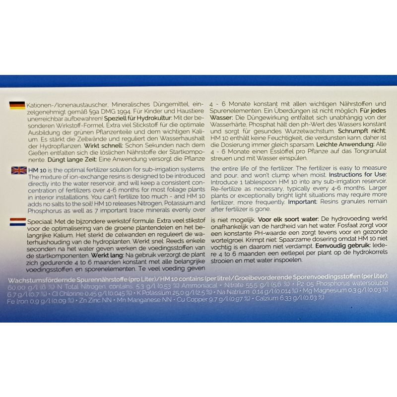 Speciální hydroponní granulované hnojivo Fleur-Ami HM 10 objem 10 litrů, které se pozvolna rozpouští a upravuje i PH. Obsahuje minerální a stopové prvky důležité pro výživu hydroponních rostlin. Dávkování jednou za 4 až 6 měsíců. Dávkování dle návodu na balení.