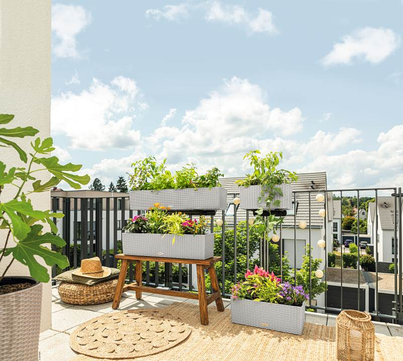 Venkovní samozavlažovací květináč Lechuza Balconera Cottage 80 Granit komplet s rozměry 80 cm x 19 cm a výškou 19 cm má šedou matnou barvu a povrchová úprava imituje pletený ratan.