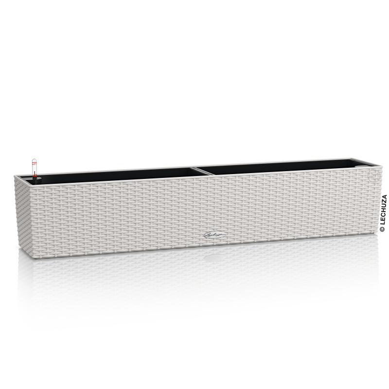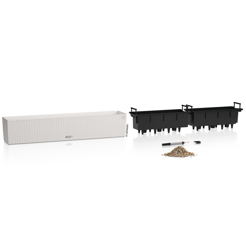 Venkovní samozavlažovací květináč Lechuza Balconera Cottage 100 White komplet s rozměry 99 cm x 19 cm a výškou 19 cm má bílou matnou barvu a povrchová úprava imituje pletený ratan.