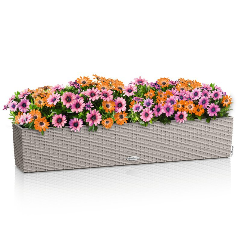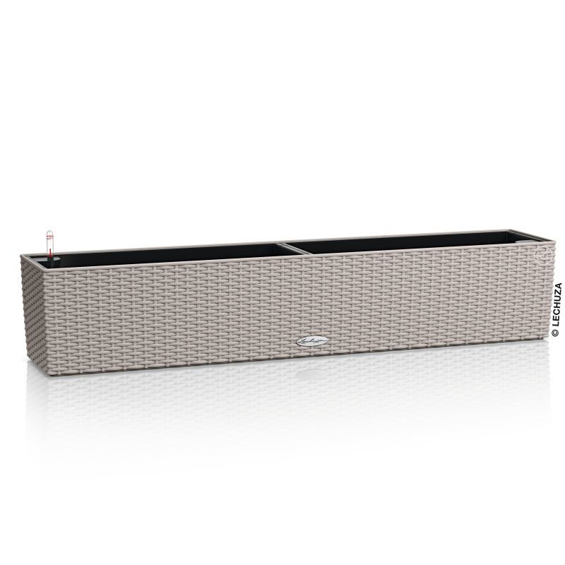Venkovní samozavlažovací květináč Lechuza Balconera Cottage 40 Light Grey komplet tvaru truhlíku s rozměry 40 cm x 19 cm a výškou 19 cm má světle šedou matnou barvu a povrchová úprava imituje pletený ratan.