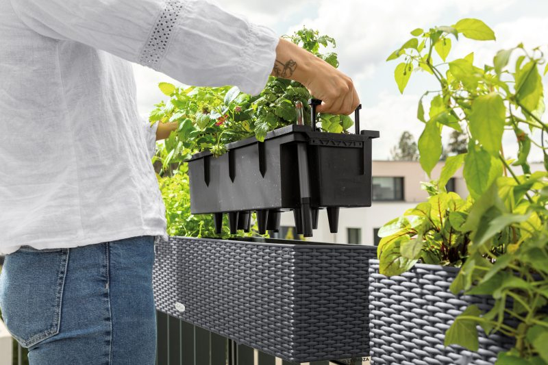 Venkovní samozavlažovací květináč Lechuza Balconera Cottage 50 Black komplet s rozměry 50 cm x 19 cm a výškou 19 cm má černou matnou barvu a povrchová úprava imituje pletený ratan. Květináč má zásobník na 3 litry vody a odtokový ventil na přebytečnou dešťovou vodu.