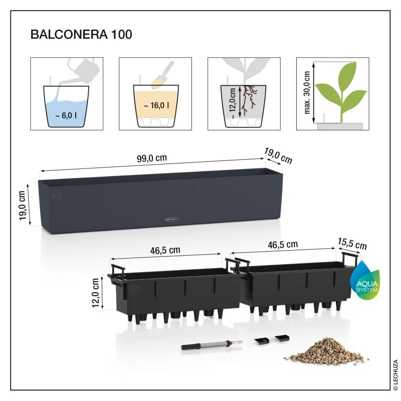 Venkovní samozavlažovací květináč Lechuza Balconera Cottage 100 Granit komplet s rozměry 99 cm x 19 cm a výškou 19 cm má šedou matnou barvu a povrchová úprava imituje pletený ratan.