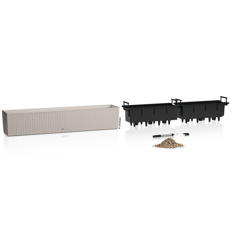 Venkovní samozavlažovací květináč Lechuza Balconera Cottage 40 Sand Brown komplet tvaru truhlíku s rozměry 40 cm x 19 cm a výškou 19 cm má světle béžovou matnou barvu a povrchová úprava imituje pletený ratan.
