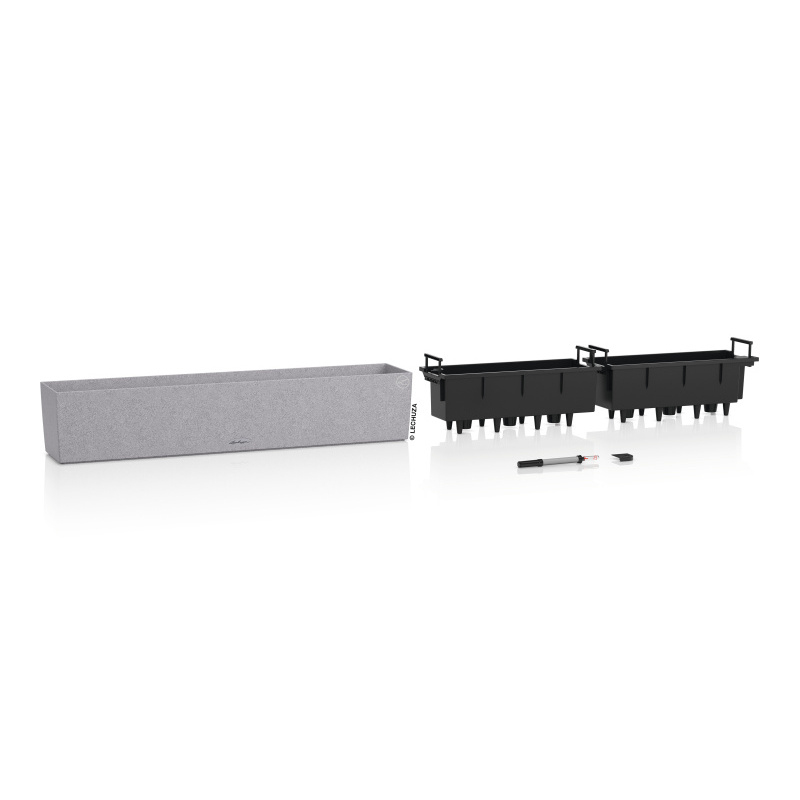 Venkovní samozavlažovací květináč Lechuza Balconera Stone 50 šedý komplet ve tvaru truhlíku s rozměry 50 cm x 19 cm a výškou 19 cm má šedou matnou barvu a je vyroben z probarveného plastu. Povrch imituje hrubý kámen.