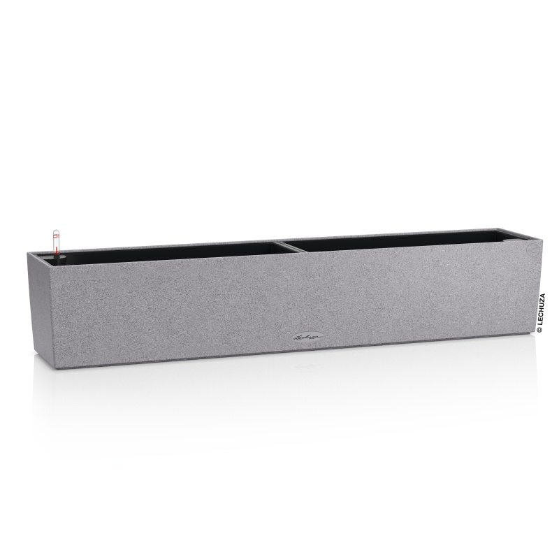 Venkovní samozavlažovací květináč Lechuza Balconera Stone 100 Grey komplet tvaru truhlíku s rozměry 99 cm x 19 cm a výškou 19 cm má strukturovaný povrch s šedou matnou barvou, který je vyroben z probarveného plastu imitující hrubý kámen. Květináč má zásobník na 6 litrů vody a odtokový ventil na přebytečnou dešťovou vodu. Doporučené max. výška rostliny 30 cm a 12 cm výška kořenového balu. Součástí balení je vodoznak zobrazující aktuální hladinu vody a proto již nehrozí přelití květiny. Květináč je vyroben z kvalitního plastu, který odolává prasknutí a extrémním teplotám okolo -30 stupňů. Je určen do interiéru i exteriéru. Lze dokoupit závěsné háky pro zavěšení na balkóně.
