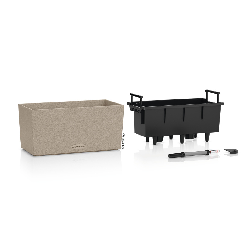 Venkovní samozavlažovací květináč Lechuza Balconera Stone 80 béžový komplet ve tvaru truhlíku s rozměry 80 cm x 19 cm a výškou 19 cm má matnou béžovou barvu, který je vyroben z probarveného plastu imitující hrubý kámen.