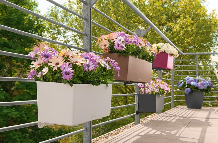 Jednostrané Lechuza závěsné háky WALL v bílém provedení pro květináče Lechuza Balconera Cottage, Lechuza Balconera Trend i Balconera Stone. Háky lze přichytit na plné (skleněné nebo betonové) zábradlí do šířky madla 110 cm.