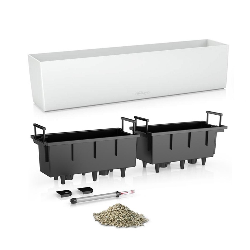 Venkovní samozavlažovací květináč Lechuza Balconera Trend 50 bílý komplet s rozměry 50 cm x 19 cm a výškou 19 cm má bílou matnou barvu a je z probarveného plastu.