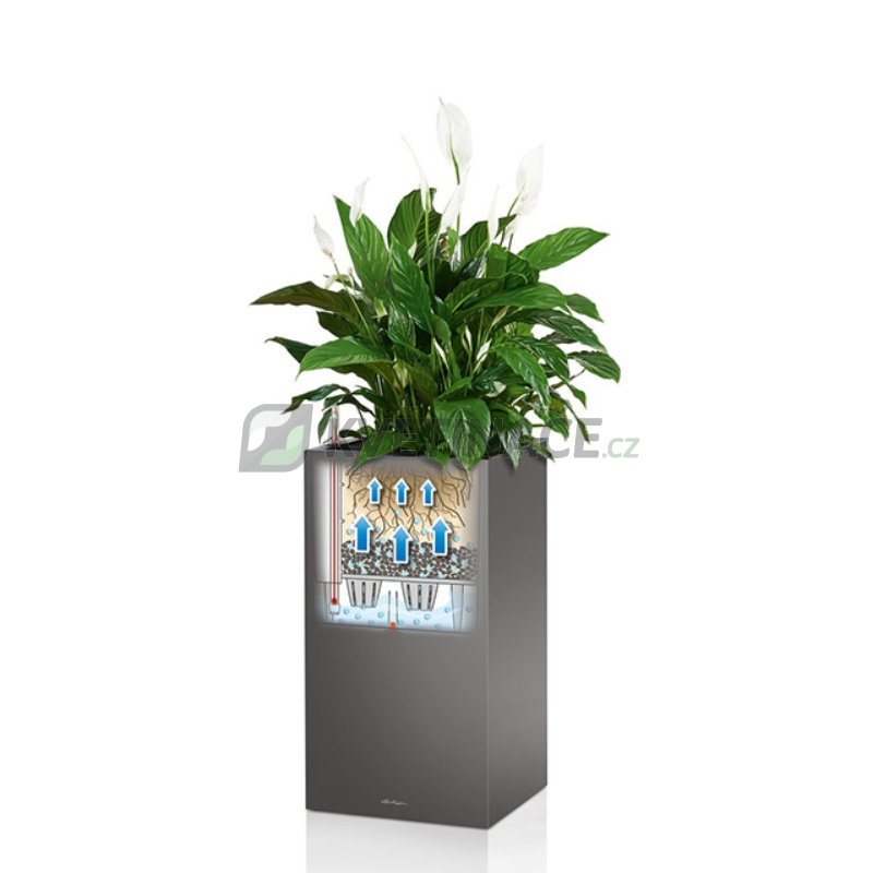 Lechuza Canto Premium Tower 40 antracit má lakovaný povrch s metalickou šedou barvou a rozměry 40x40x76cm. Je vhodný do interiéru i exteriéru s možností dokoupit pojezdová kolečka 50 pro snadnou manipulaci. Květináč obsahuje samozavlažovací set s nádrží na vodu 7 litrů a objem zeminy na 29 litrů.