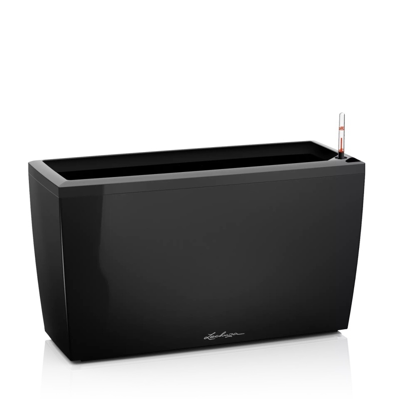 Samozavlažovací květináč Lechuza Cararo Black komplet tvaru truhlíku má černou lesklou barvu a povrch je lakovaný. Květináč je vhodný do interiéru a exteriéru. Balení obsahuje samozavlažovací systém Lechuza, v kterém je ukazatel hladiny vody. Dále druhé dno jako nádrž vody a jeden výpustný ventil pro odtok přebytečné dešťové vody. Díky tomuto systému již není možné utopení květiny i při intenzivním dešti. Součástí balení jsou pojezdová kolečka.