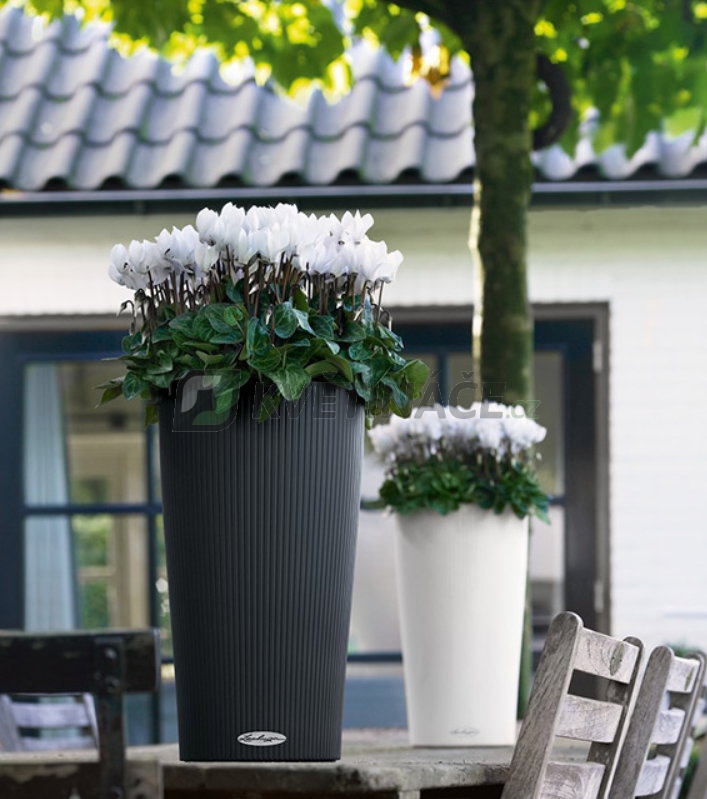Samozavlažovací květináč Lechuza Cilindro Trend 23 Slate komplet s horním vnějším průměrem 23 cm a výškou 41 cm má břidlicovou matnou barvu a povrch je z probarveného plastu. Květináč je vhodný do interiéru i exteriéru. Balení obsahuje samozavlažovací systém Lechuza, v kterém je ukazatel hladiny vody.