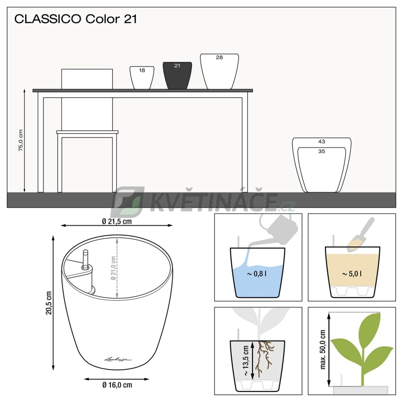 Samozavlažovací Set systém Classico 21, který se vkládá do Lechuza květináčů Classico 21. V balení je vodoznak na vodu, Lechuza PON na drenáž, oddělující dno na vodu a krytka na šachtu vody.