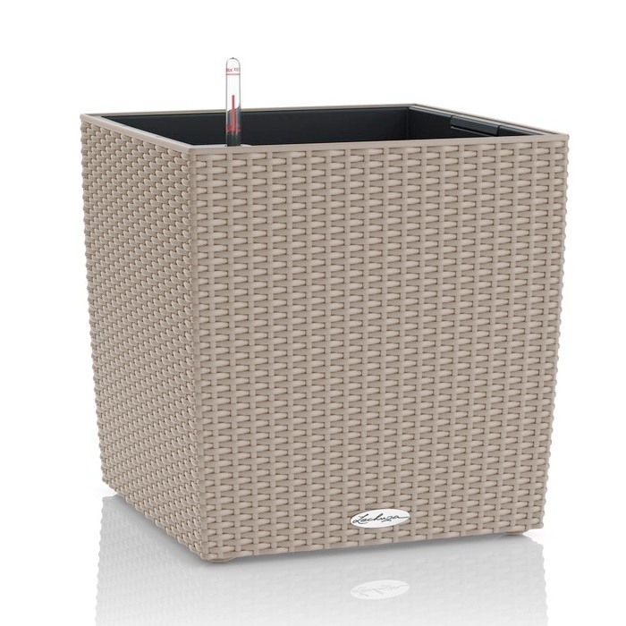 Samozavlažovací květináč Lechuza Cube Cottage 30 Sand Brown komplet s šířkou 30 cm a výškou 30 cm má světlou béžovou matnou barvu a povrch je z probarveného plastu imitující pletený ratan.