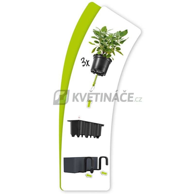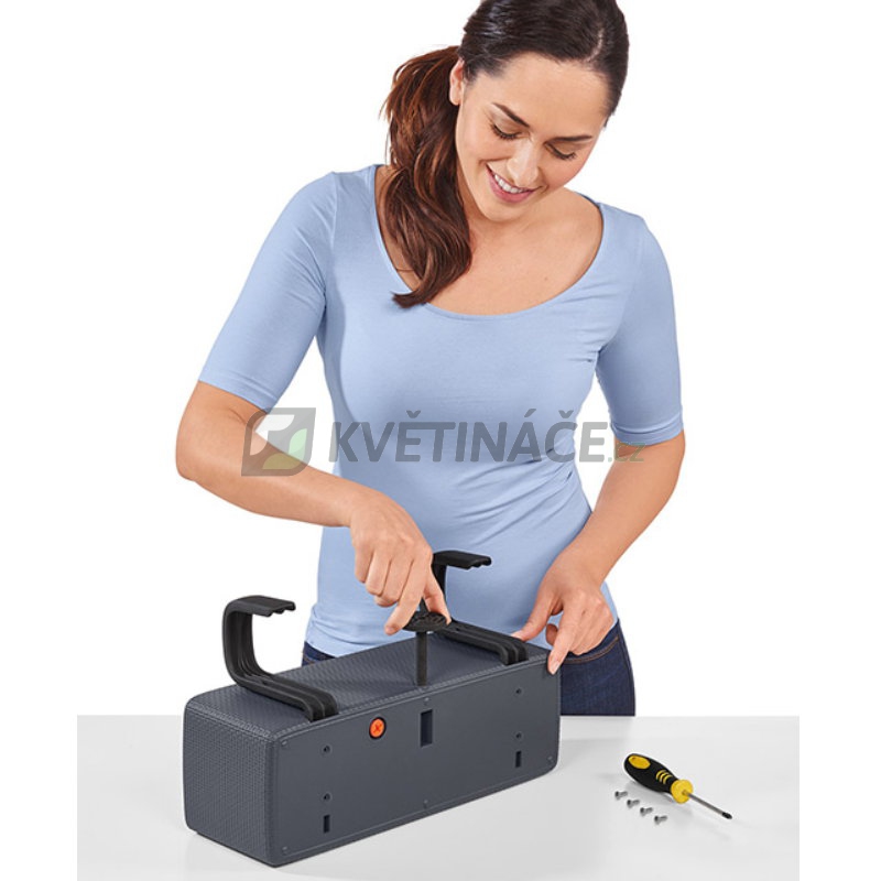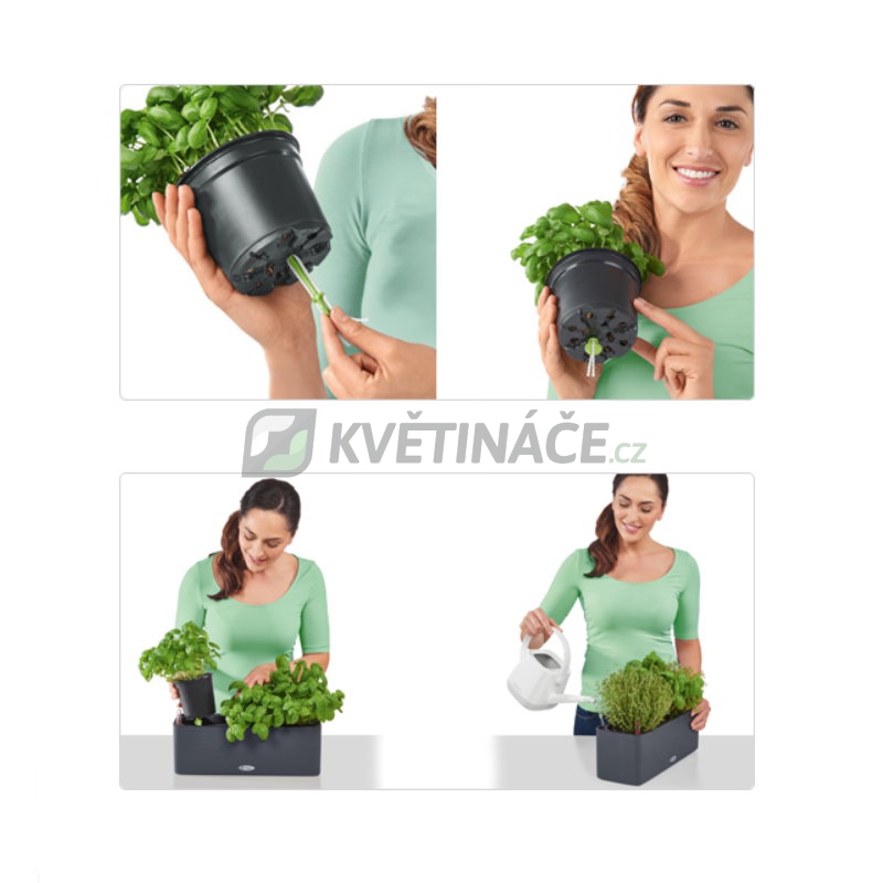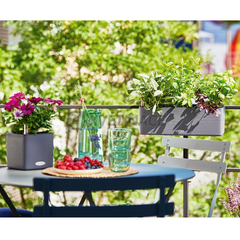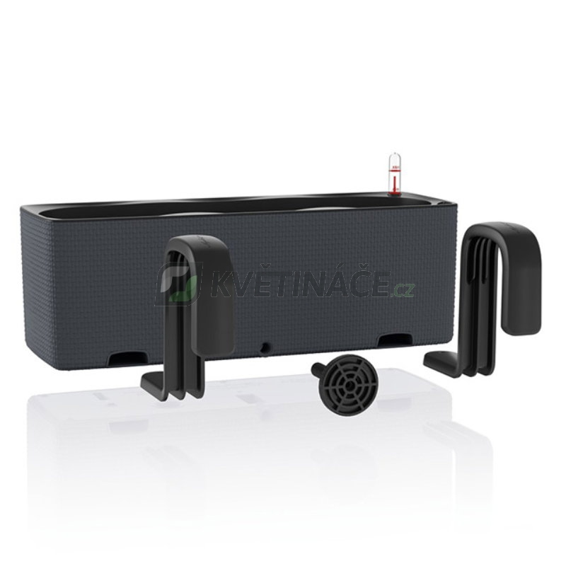 Samozavlažovací truhlík Cube Trend 14 s břidlicovou matnou barvou s rozměry 40x14x14cm. Vhodný na pěstování třech bylinek s průměrem pěstebního květináče 10 až 12cm. Je vyrobený z probarveného plastu s povrchovou úpravou imitací pleteného ratanu.