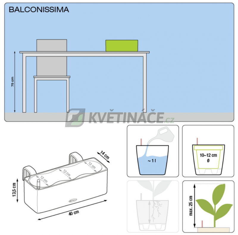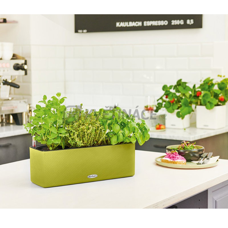 Samozavlažovací truhlík Cube Trend 14 s limetkovou matnou barvou s rozměry 40x14x14cm. Vhodný na pěstování třech bylinek s průměrem pěstebního květináče 10 až 12cm. Je vyrobený z probarveného plastu s povrchovou úpravou imitací pleteného ratanu. Díky knotu je zasazení rostlin jednoduché a výměna uhynulých bylinek je velice rychlá. Zásobník na vodu o objemu na 1 litr. Doporučená výška rostliny je 25 cm bez květináče. Součástí balení jsou plastové závesné háky na balkon s šířkou madla do 5,5cm.