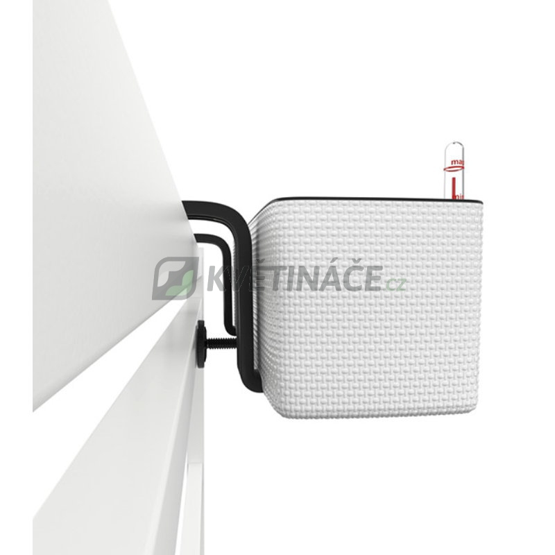 Samozavlažovací stolní květináč Lechuza Cube Trend Color 14 White komplet s šířkou 14 cm a výškou 14 cm má bílou matnou barvu a povrch je z probarveného plastu imitující pletený ratan. Květináč je vhodný do interiéru. Balení obsahuje samozavlažovací systém Lechuza, v kterém je ukazatel hladiny vody. Dále druhé dno pro nádrž vody na 0,4 litrů. Vhodné na bylinky.