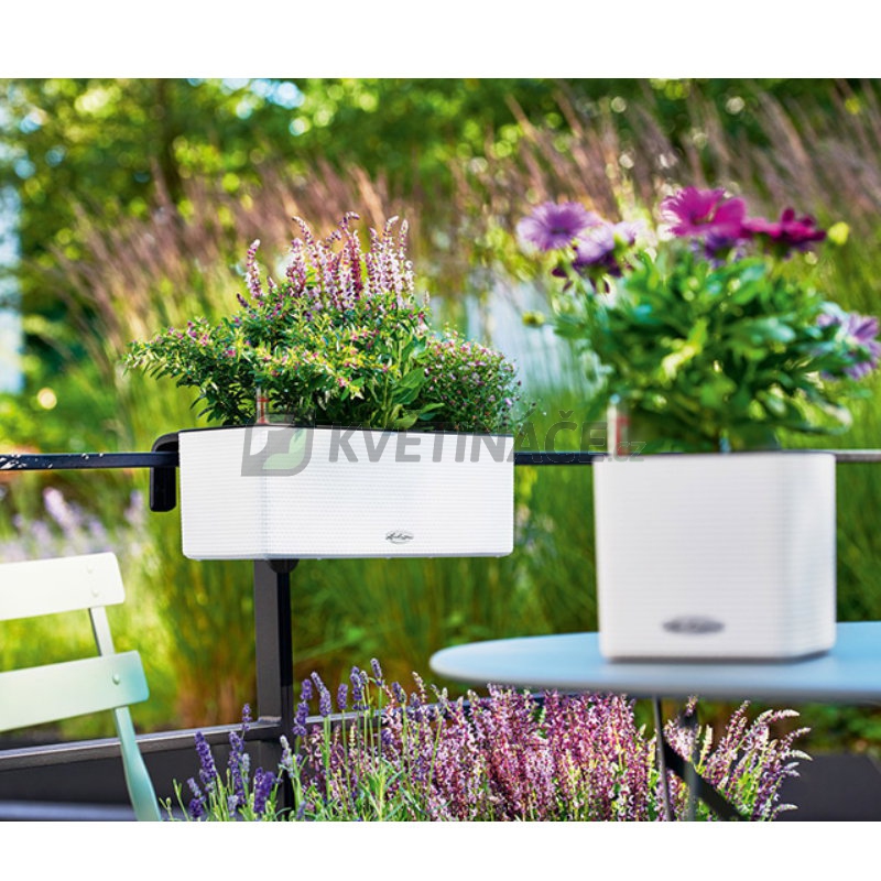 Samozavlažovací truhlík Lechuza Cube Trend 14 bílý má matnou barvu s rozměry 40x14x14cm. Vhodný na pěstování třech bylinek s průměrem pěstebního květináče 10 až 12cm. Je vyrobený z probarveného plastu s povrchovou úpravou imitací pleteného ratanu.