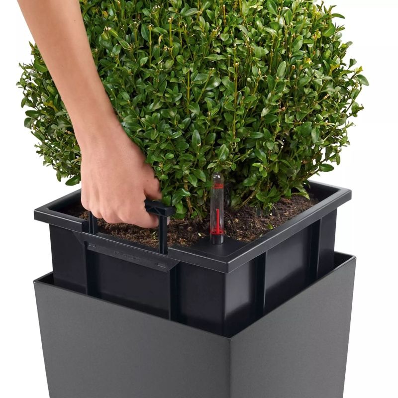 Samozavlažovací květináč Lechuza Cubico premium 30 Antracit komplet s šířkou 30 cm a výškou 56 cm má metalickou antracitovou barvu a povrch je lakovaný. Květináč je určen pro venkovní a interiérové využití. V balení je samozavlažovací systém Lechuza.