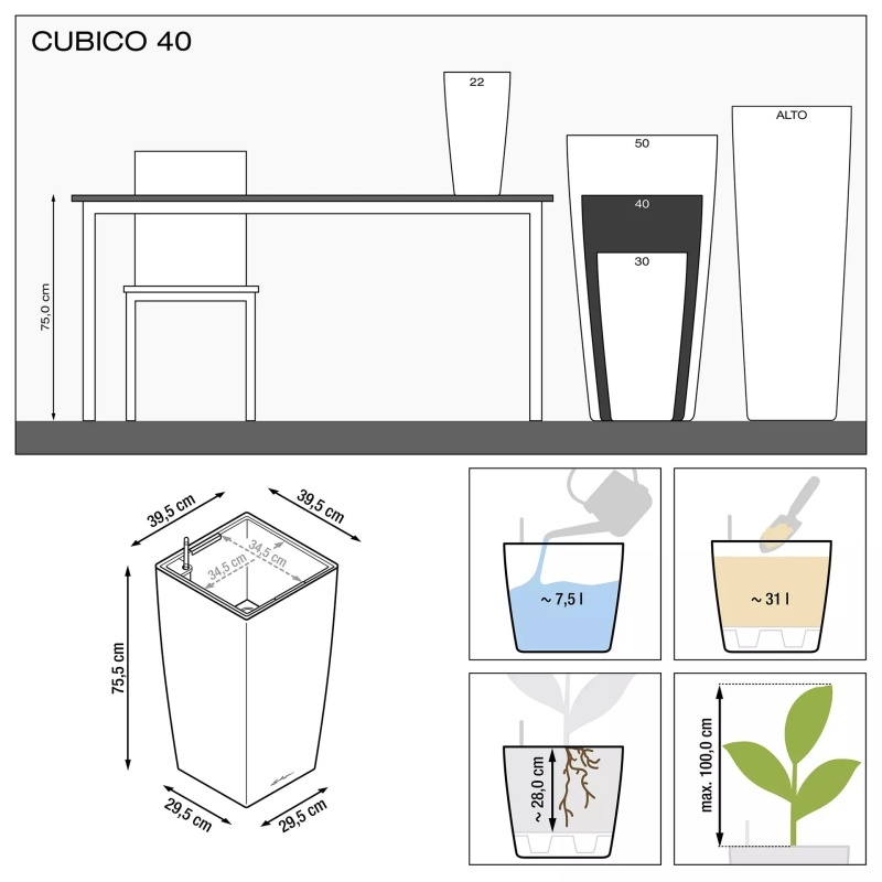 Samozavlažovací květináč Lechuza Cubico Alto Antracit komplet s šířkou 40 cm a výškou 105 cm má antracitovou metalickou barvu a je z lakovaného plastu. Květináč je vhodný do interiéru i exteriéru.
