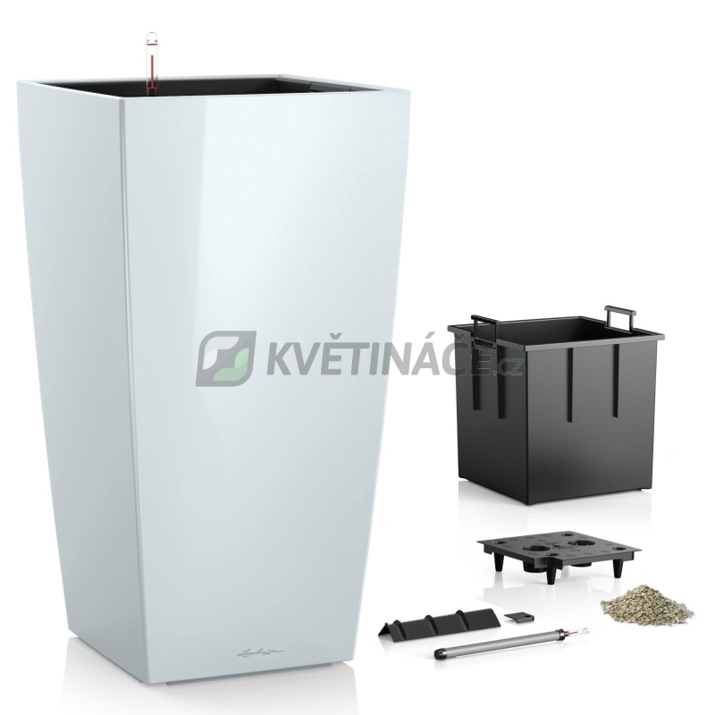 Samozavlažovací květináč Lechuza Cubico premium 50 Black komplet s šířkou 50cm a výškou 95cm má lesklou černou barvu a povrch je lakovaný. Květináč je určen pro venkovní a interiérové využití. V balení je samozavlažovací systém Lechuza, v kterém je vodoznak pro zobrazení hladiny vody. Dále druhé dno pro nádrž vody na 16 litrů a dva výpustné ventily pro odtok přebytečné dešťové vody. Díky tomuto systému již nehrozí utopení květiny i při intenzivním dešti. Doporučené maximální rozměry rostliny: výška 160cm a výška kořenového balu 36cm.