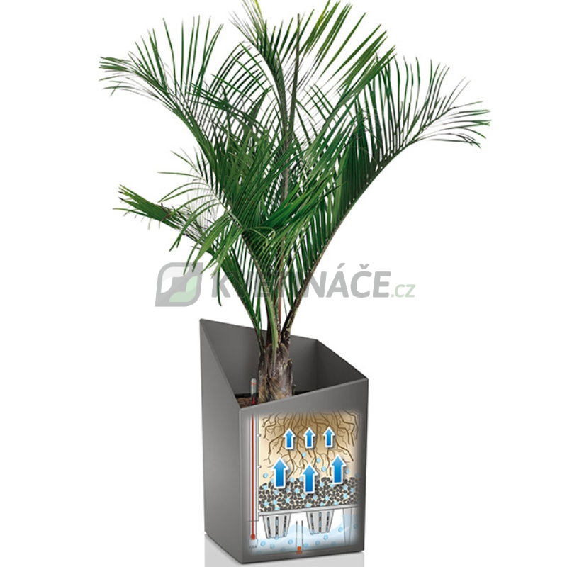 Samozavlažovací květináč Lechuza Cursivo Premium 30 Silver komplet s šířkou 30 cm a výškou 49 cm má stříbrnou metalickou barvu a povrch je z lakovaného plastu. Květináč je vhodný do interiéru a exteriéru. Balení obsahuje samozavlažovací systém Lechuza, v kterém je ukazatel hladiny vody. Dále druhé dno pro nádrž vody na 3 litry a dva výpustné ventily pro odtok přebytečné dešťové vody. Díky tomuto systému již nehrozí utopení květiny i při intenzivním dešti. Doporučené maximální rozměry rostliny: výška 60cm a výška kořenového balu 20cm.