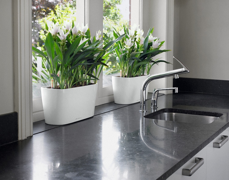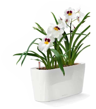 Stolní samozavlažovací květináč Lechuza Delta 10 bílý komplet s šířkou 30 cm a výškou 13 cm má lesklou smetanově bílou barvu a povrch je z lakovaného plastu.
