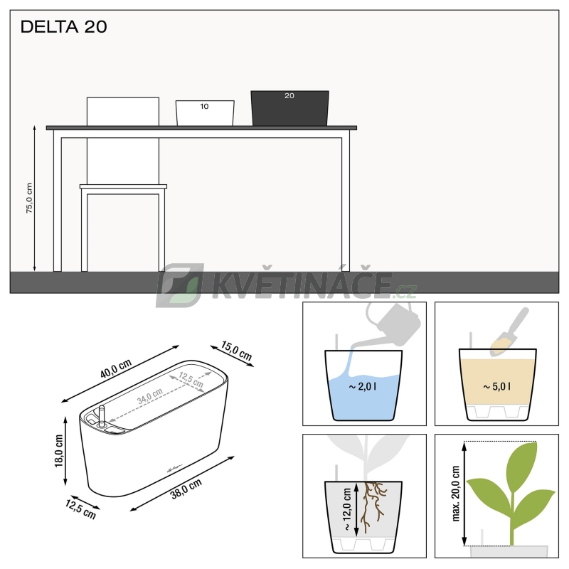 Stolní samozavlažovací květináč Lechuza Delta 20 Antracit komplet s šířkou 40 cm a výškou 18 cm má metalickou antracitovou barvu a povrch je z lakovaného plastu.
