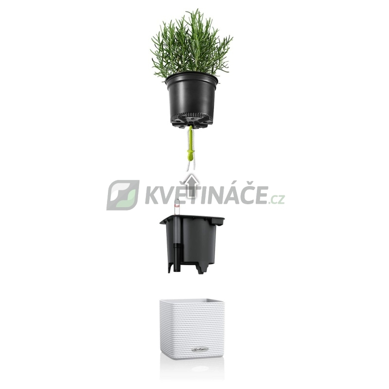 Samozavlažovací truhlík Lechuza Cube Trend 14 bílý má matnou barvu s rozměry 40x14x14cm. Vhodný na pěstování třech bylinek s průměrem pěstebního květináče 10 až 12cm. Je vyrobený z probarveného plastu s povrchovou úpravou imitací pleteného ratanu.