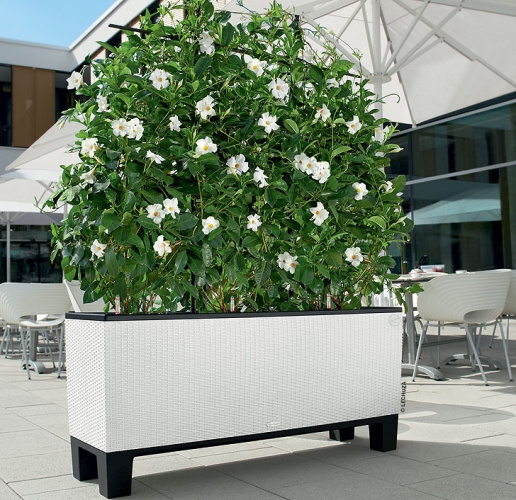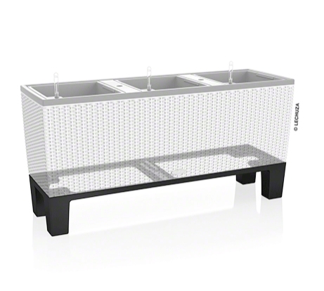Samozavlažovací květináč Lechuza Trio Cottage 40 White komplet s šířkou 130 cm x 41 cm a výškou 45 cm má bílou matnou barvu a povrch je z probarveného plastu, který dokonale imituje pletený ratan.
