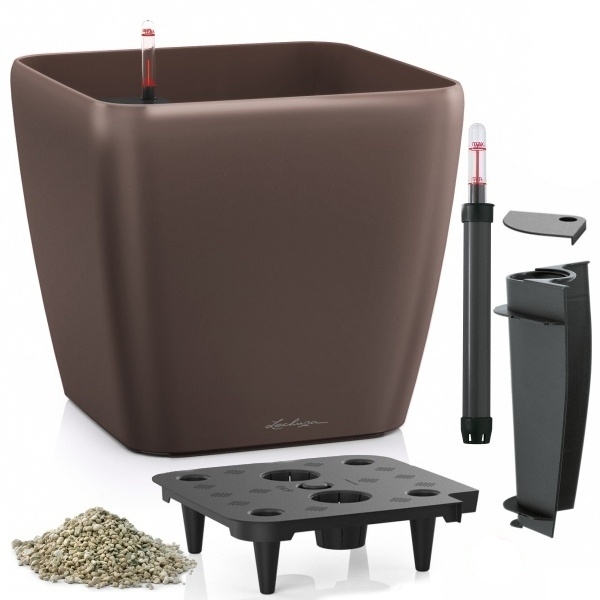 Samozavlažovací květináč Lechuza Quadro 28 Taupe komplet s šířkou 28cm a výškou 26cm má lesklou kapučíno barvu a povrch je z lakovaného plastu. Květináč je vhodný do interiéru.