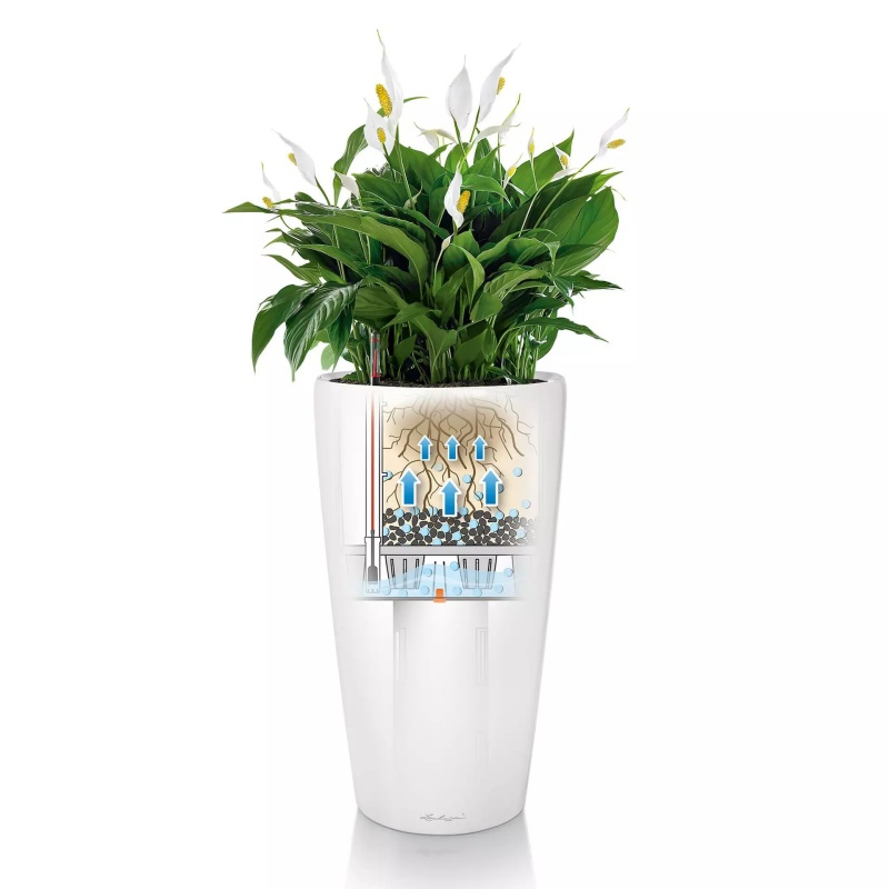 Samozavlažovací květináč Lechuza Rondo 40 bílý komplet s horním vnějším průměrem 40 cm a výškou 75 cm má smetanově bílou lesklou barvu a povrch je z lakovaného plastu.