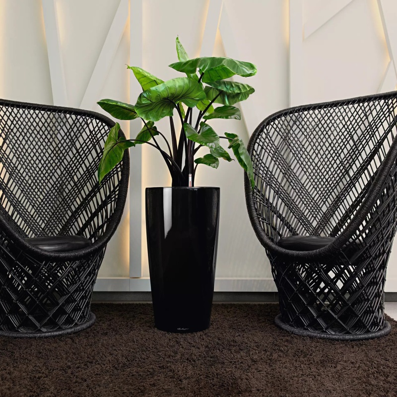 Samozavlažovací květináč Lechuza Rondo 40 Antracit komplet s horním vnějším průměrem 40 cm a výškou 75 cm má antracitovou metalickou barvu a povrch je z lakovaného plastu.