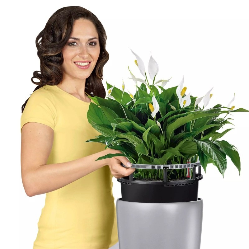 Samozavlažovací květináč Lechuza Rondo 40 Antracit komplet s horním vnějším průměrem 40 cm a výškou 75 cm má antracitovou metalickou barvu a povrch je z lakovaného plastu.