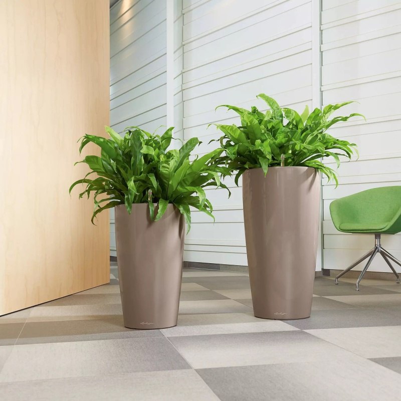 Samozavlažovací květináč Lechuza Rondo 40 Taupe komplet s horním vnějším průměrem 40 cm a výškou 75 cm má kapučíno lesklou barvu a povrch je z lakovaného plastu.