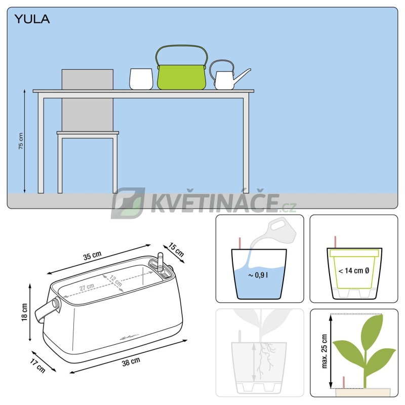 Samozavlažovací květináč Lechuza Yula Trend Color truhlík bílo-zelený komplet s šířkou 35 cm, hloubkou 17 a výškou 18 cm má hladkou polo-lesklou barvu. Květináč je vyroben z probarveného plastu. Květináč Yula Trend truhlík je vhodný do interiéru na pěstování malých rostlin jakou jsou bylinky, kaktusy a drobné rostliny v původním pěstebním květináči o průměru 12cm. Balení obsahuje samozavlažovací systém Lechuza, v kterém je ukazatel hladiny vody. Dále druhé dno pro nádrž vody na 0,9 litrů. Doporučené maximální výška rostliny 25cm.