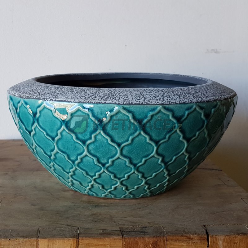 Stolní keramický květináč Trento ve tvaru mísy má lesklou tyrkysovou barvu a rozměry 27x13cm. Ručně vyrobené a odolné proti poškrábání. Použití v interiéru a letním období i v exteriéru. Nádoba je vodotěsná.