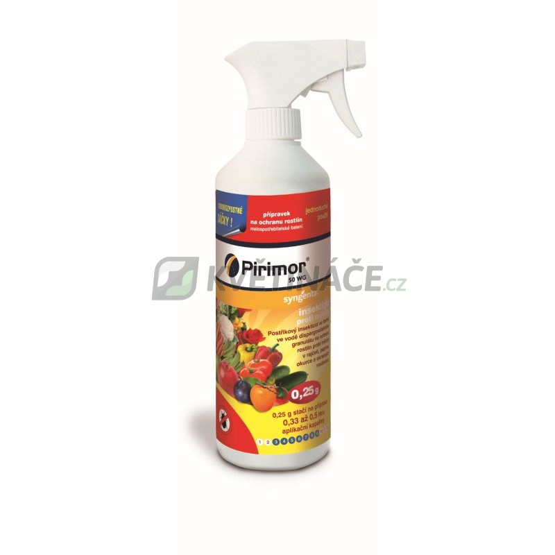 AGRO Pirimor 50 WG je účinný insekticid proti mšicím. Působí jako dotykový, dýchací a požerový jed. Má vysoké spektrum účinnosti (mšice na jádrovinách, okrasných rostlinách, okurkách, peckovinách, hrachu, květáku, kořenové zelenině, salátu apod.). Nepoškozuje užitečný hmyz. Při kontaktu se zemí se rychle rozkládá bez rizika následných reziduí v půdě nebo vodě. Přípravek je odolný vůči mrazu.